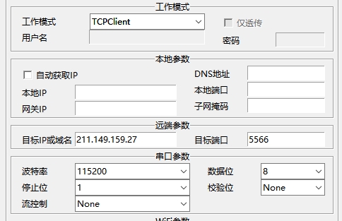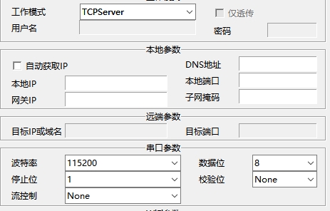 5. 做客戶端。波特率為115200 校驗(yàn)數(shù)據(jù)停止為 0 8 1。串口流控制為None。工作方式為TCP Client。目標(biāo)ip:自己服務(wù)器的ip,端口自己服務(wù)器開發(fā)端口,其他不用變。點(diǎn)擊端口2設(shè)置。